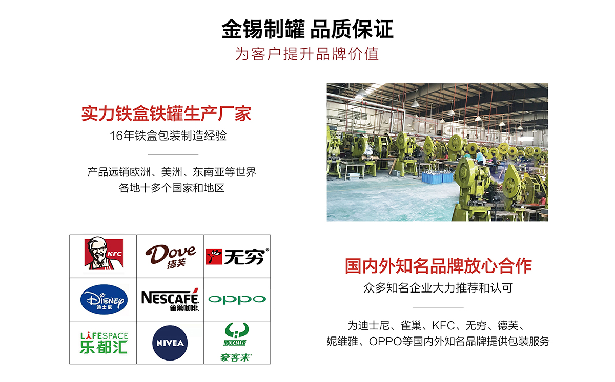 廣州市金錫五金制品有限公司成立于2016年,是已有13年生產經驗的實力廠家。我廠是專業(yè)定制優(yōu)良馬口鐵盒、鐵罐、禮品盒、茶葉罐、月餅盒等金屬鐵盒包裝的制罐企業(yè),我們擁有超過6000平方米的標準現(xiàn)代化廠房及八條生產線。公司集產品研發(fā)、設計、生產、銷售于一體,技術優(yōu)良,實力雄厚。通過十多年的制罐經驗,我們擁有專業(yè)的技術團隊,嚴格的作業(yè)流程、完整的品質保障體系、完善的銷售以及售后服務系統(tǒng)。